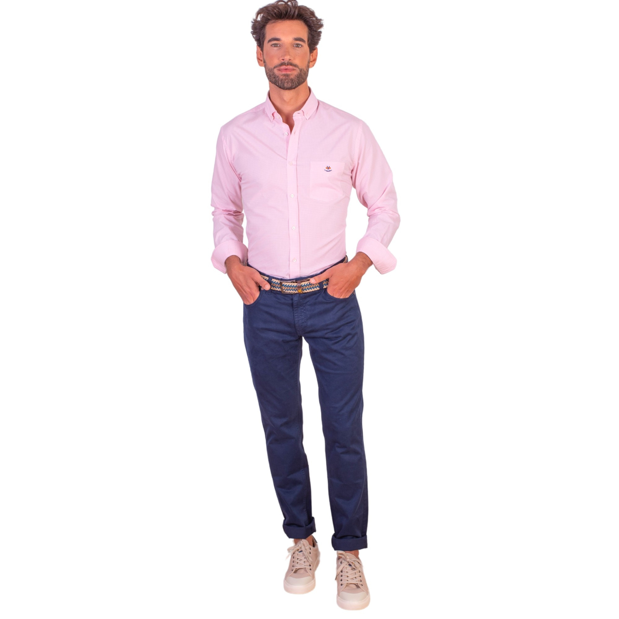 Camisa regular algodón micro cuadro color rosa con bolsillo y cuello botón para hombre. Confeccionada en algodón 100%.