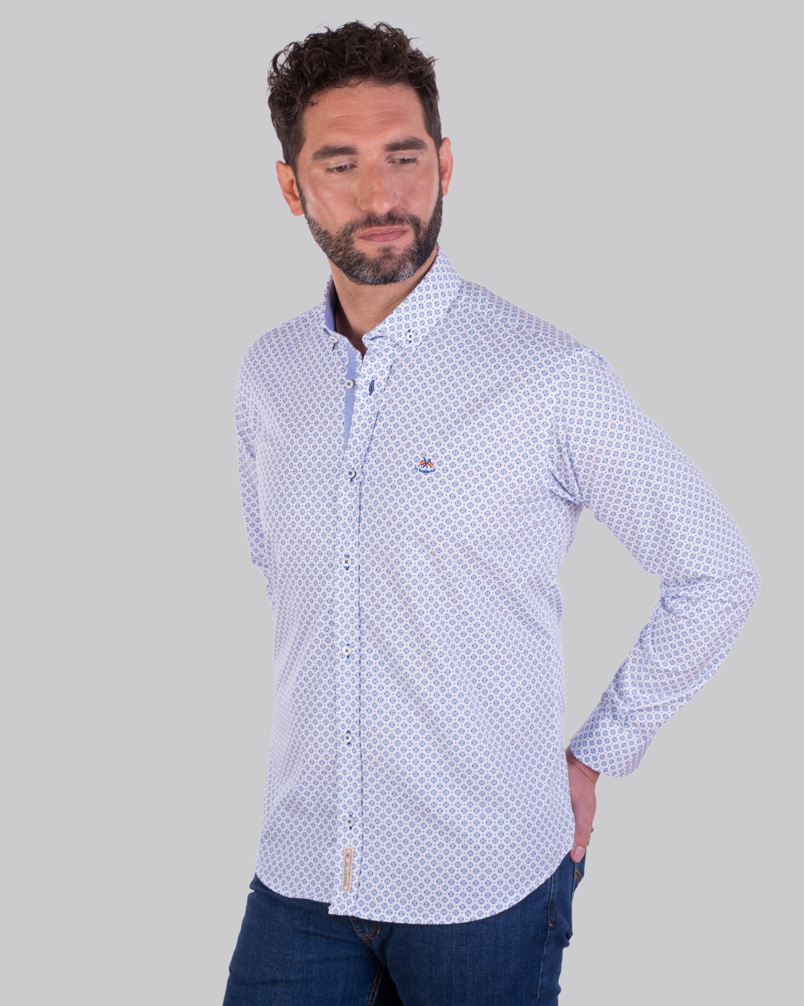 Camisa semientallada con estampado y logo bordado. Confeccionada en tejido micro estampado y algodón 100%.