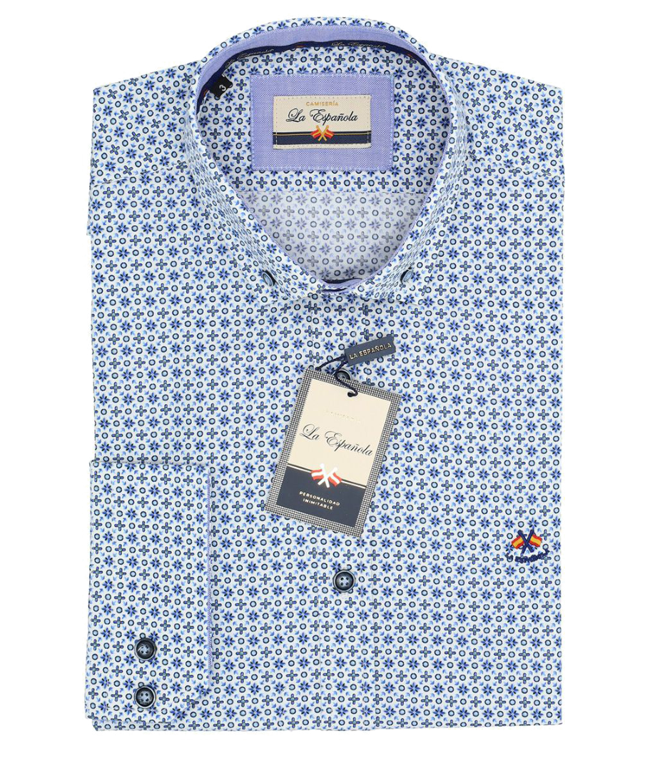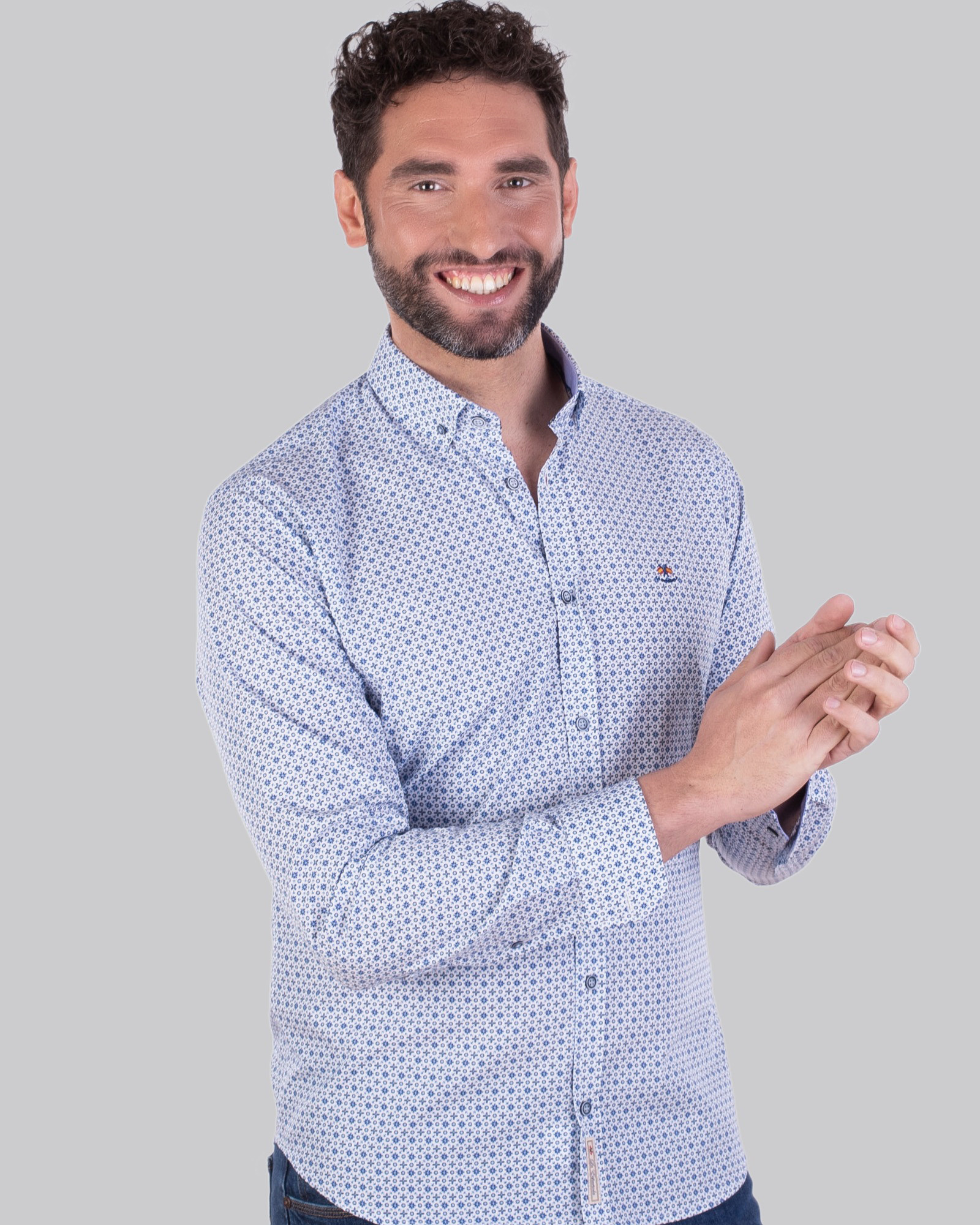Camisa semientallada con cuello botón y logo bordado. Confeccionada en tejido microestampado algodón 100%.