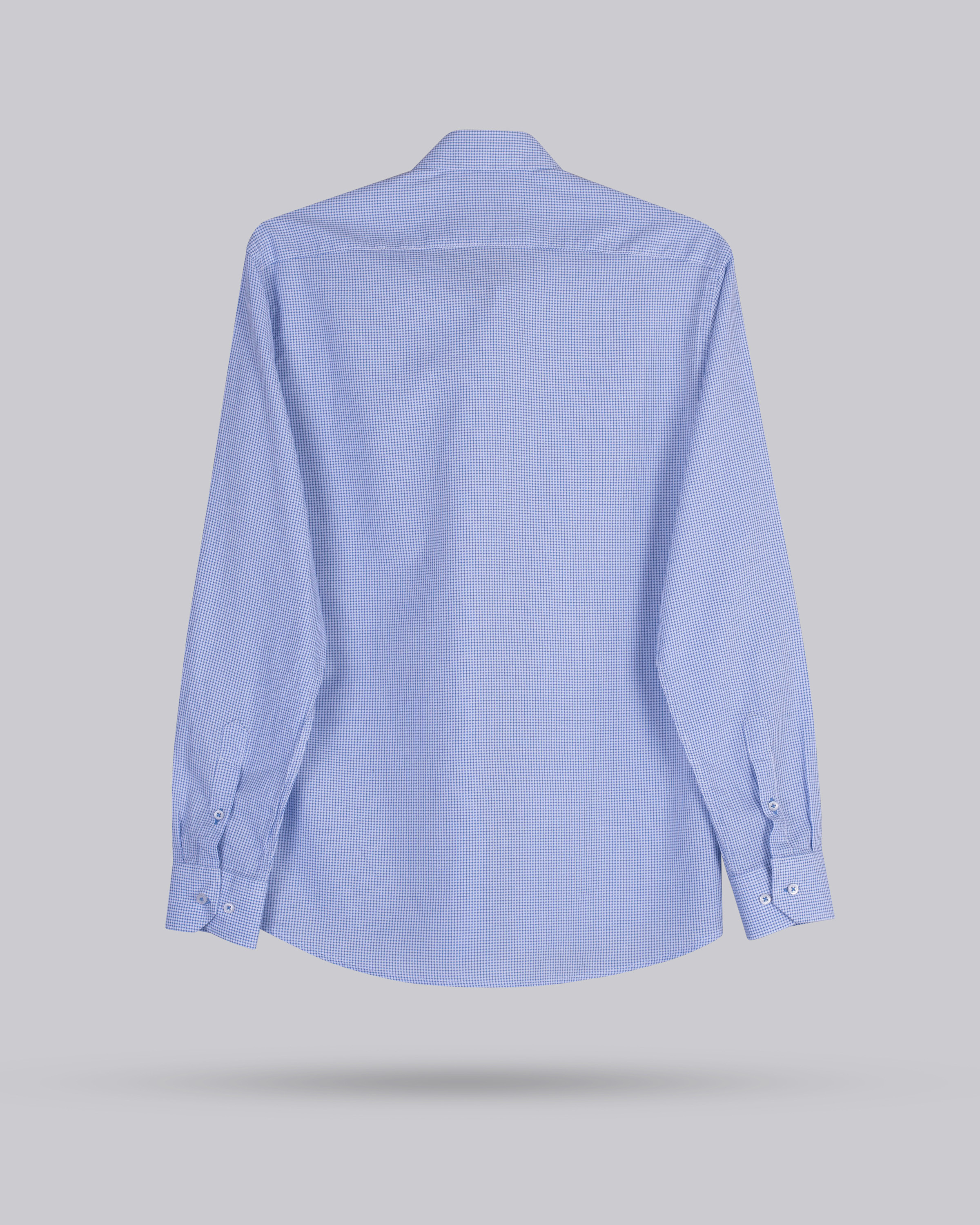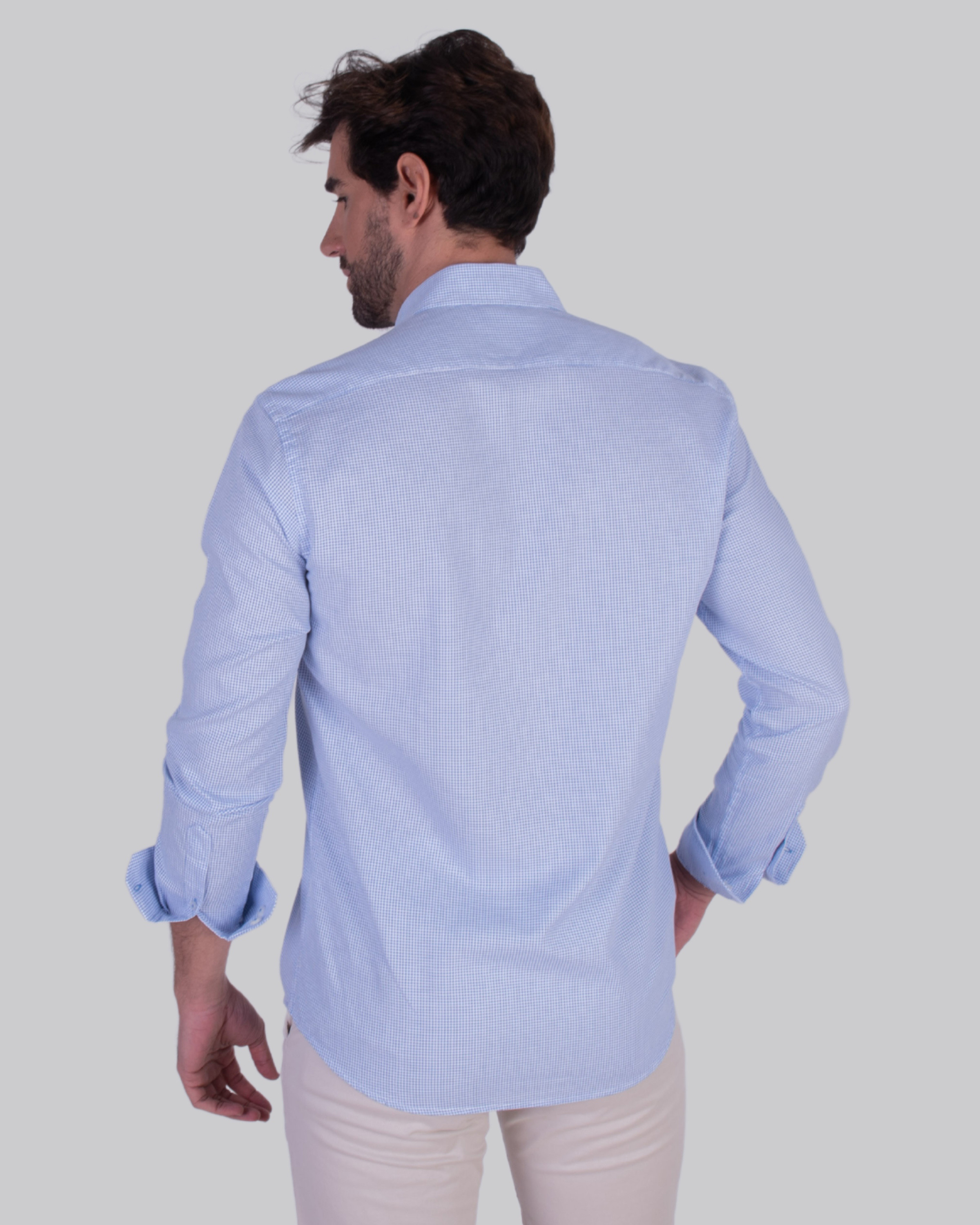 Camisa semientallada con  microcuadro color azul y cuello botón. Confeccionada en algodón 100%.