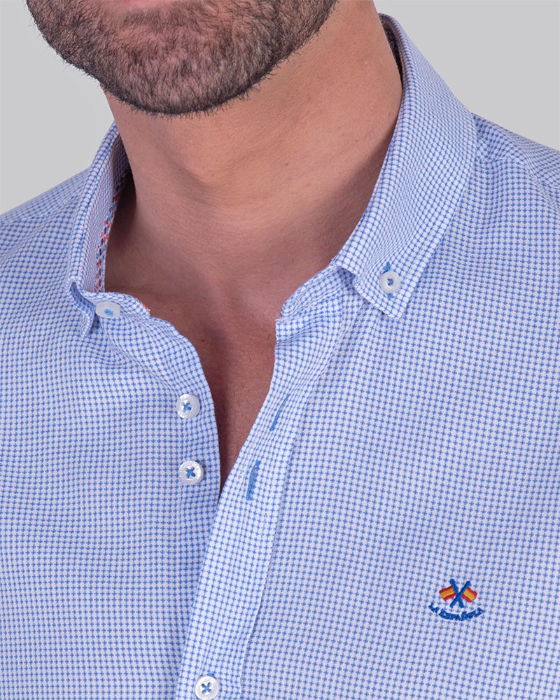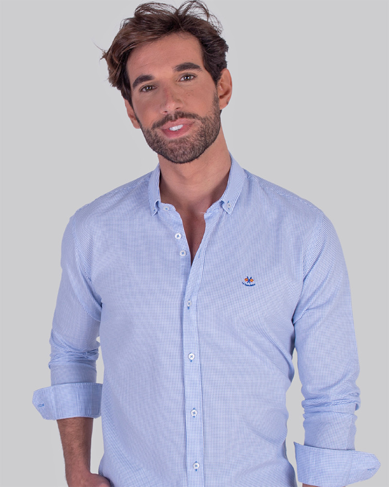 Camisa semientallada microcuadros color azul y cuello botón. Confeccionada en algodón 100%.