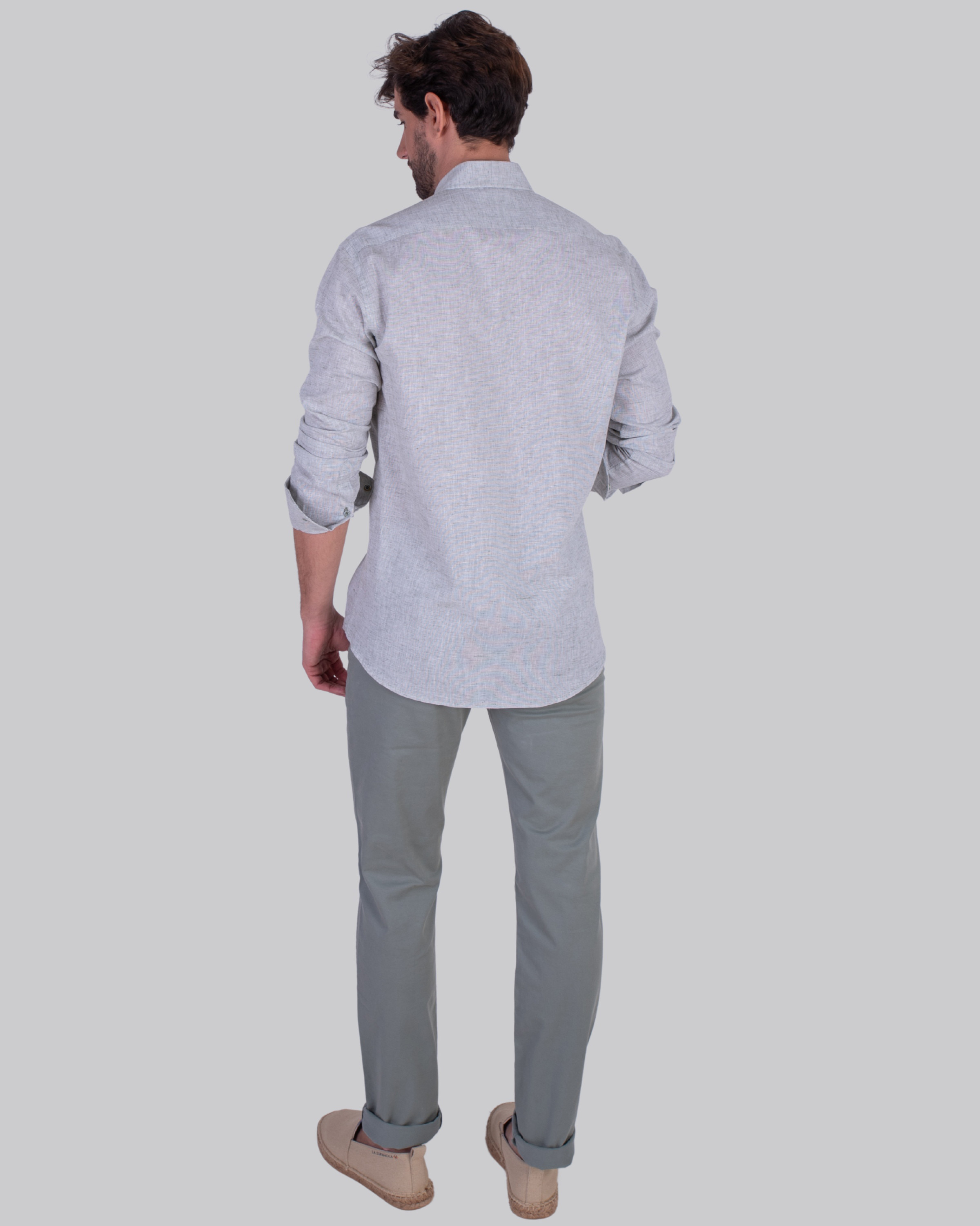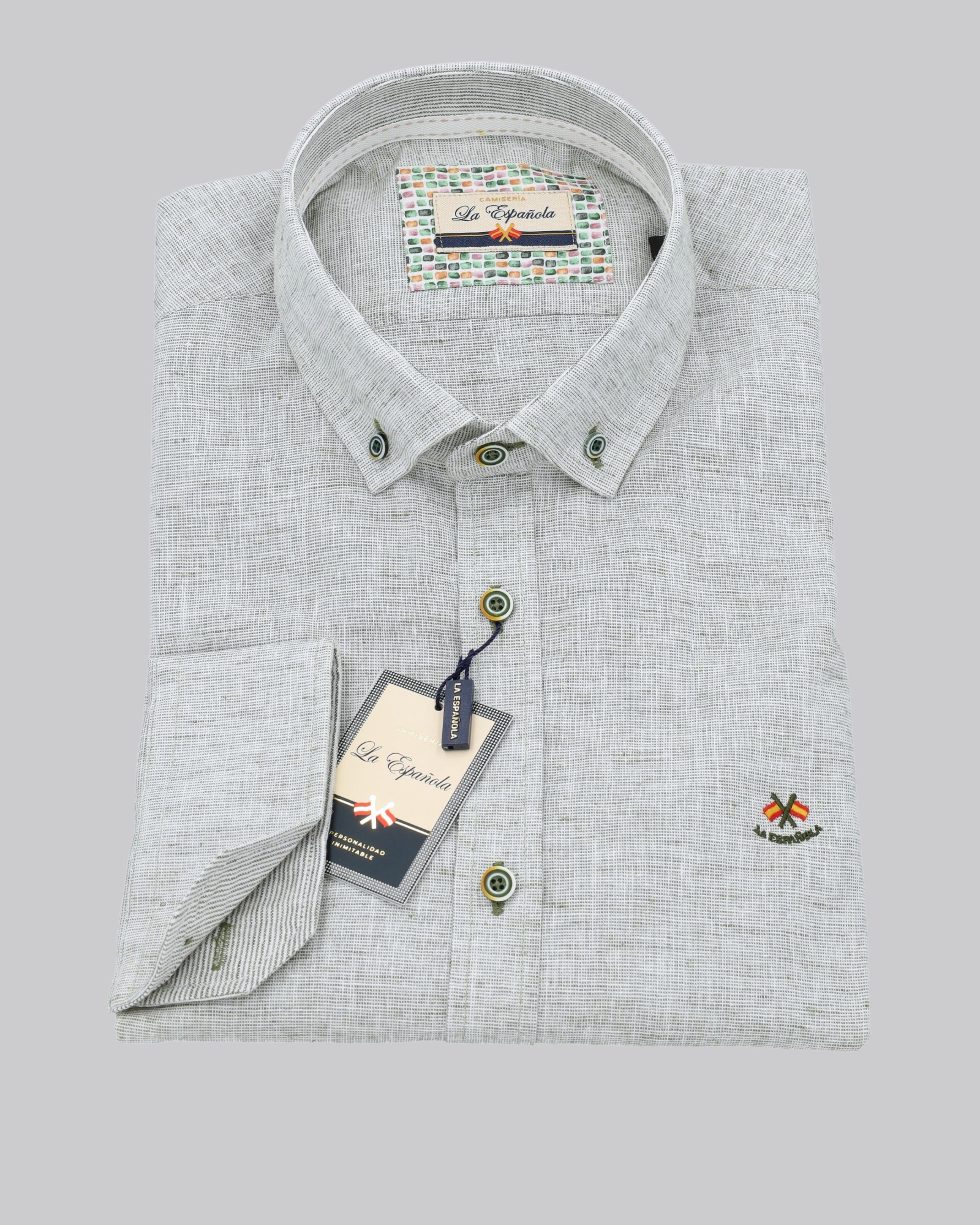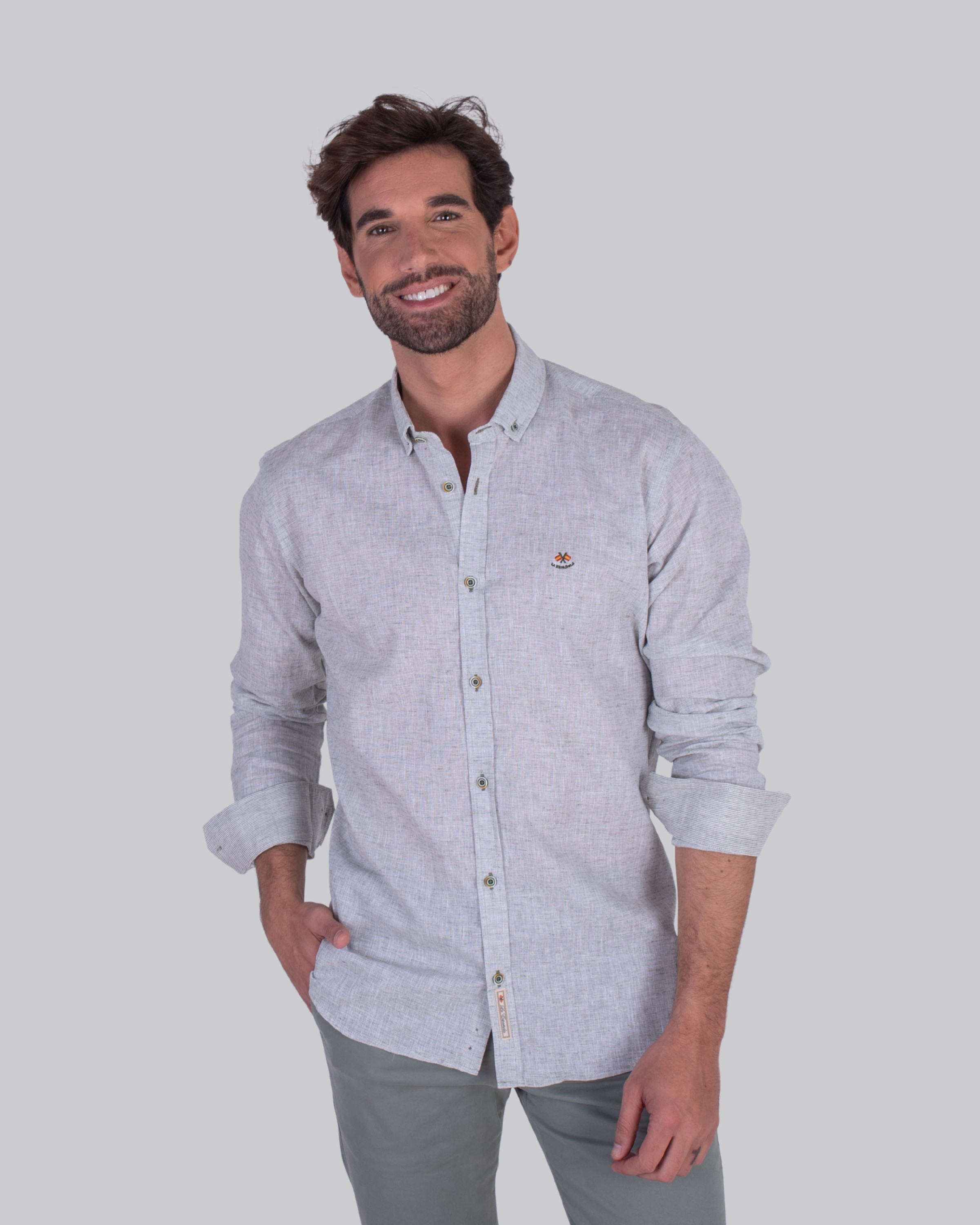Camisa semientallada lisa, cuello botón y puño combinado para hombre, confeccionada en 50% algodón/50% lino, perfecta para llevarla todo el día.