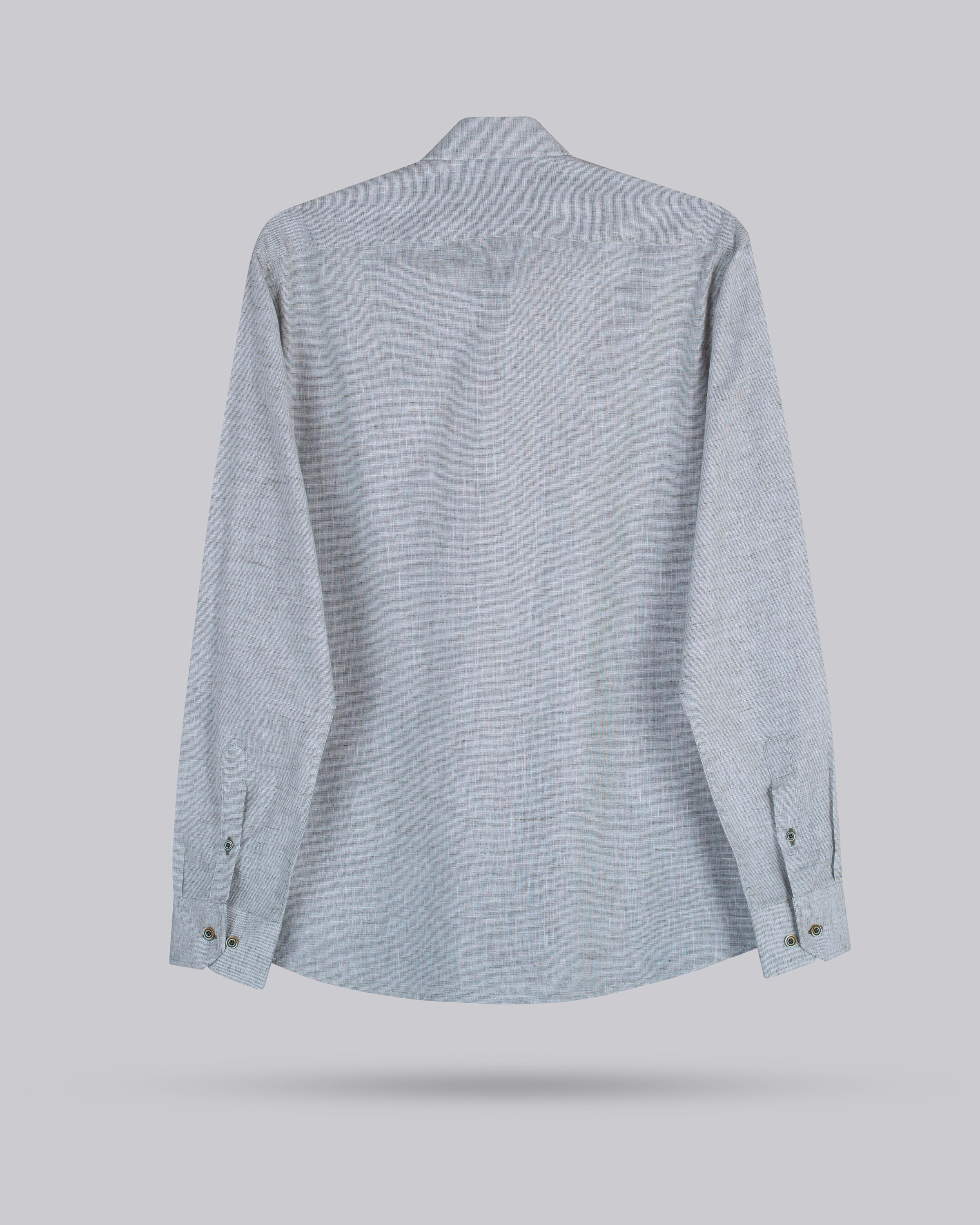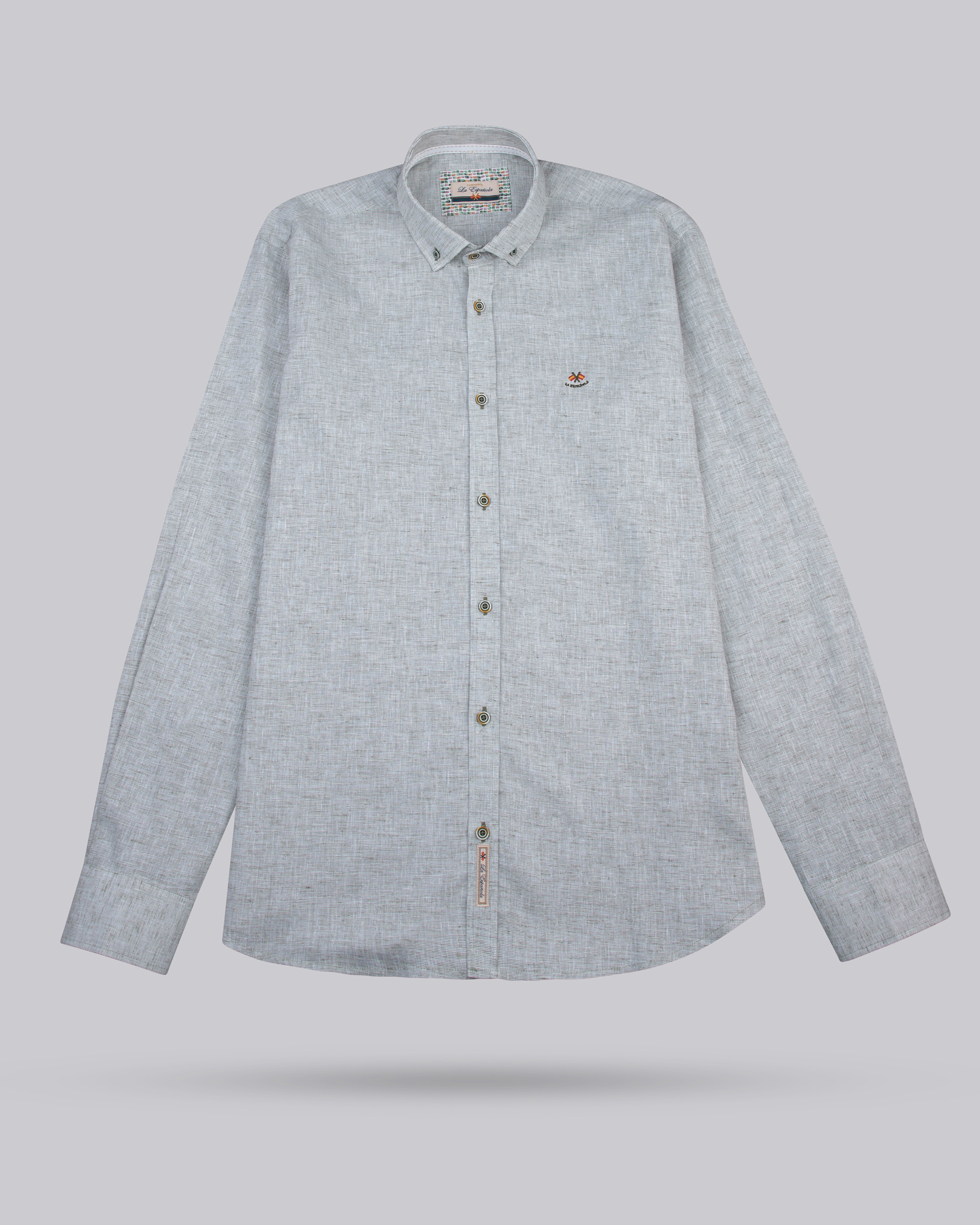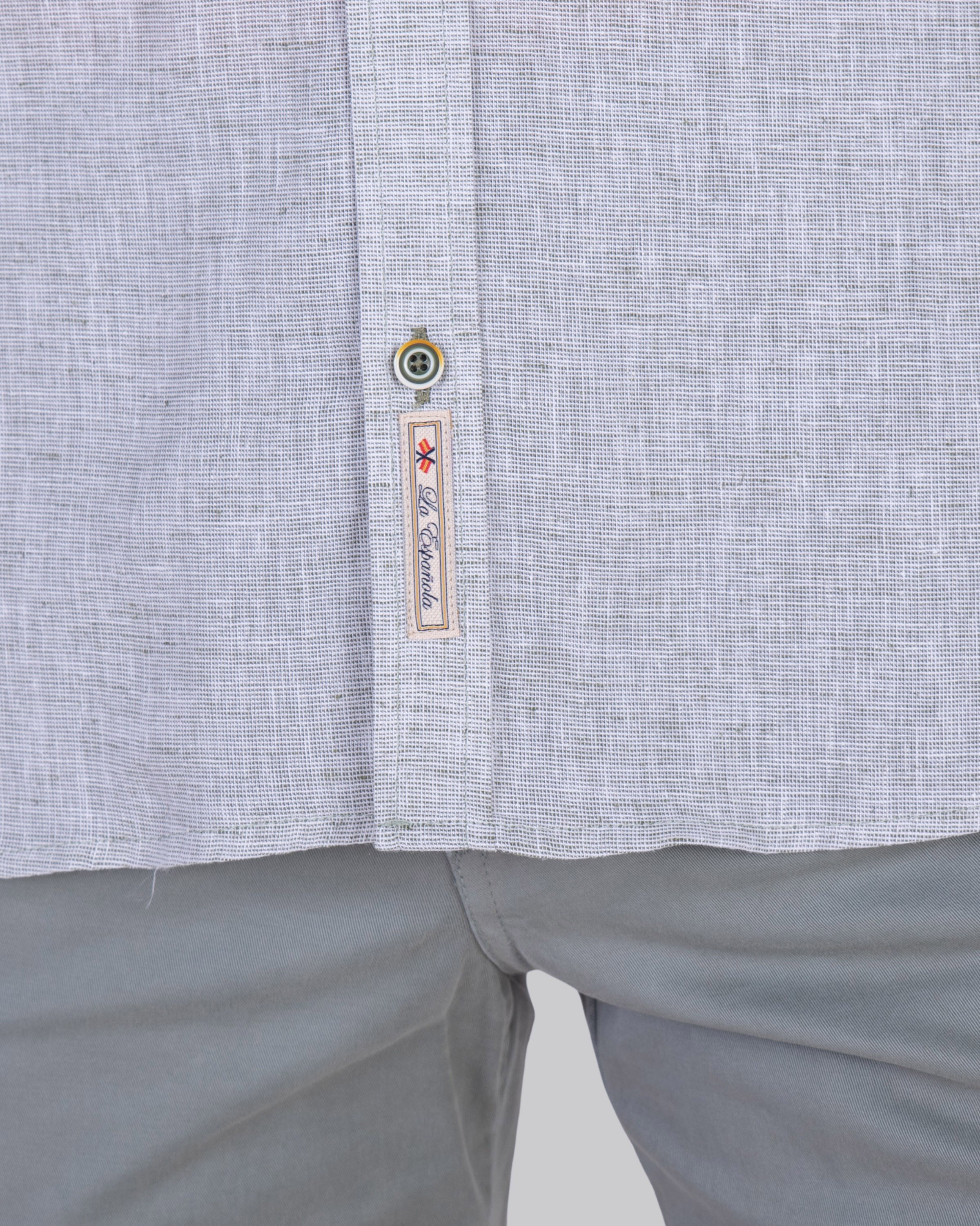 Camisa semientallada lisa, cuello botón y puño combinado para hombre, confeccionada en 50% algodón/50% lino, perfecta para llevarla todo el día.