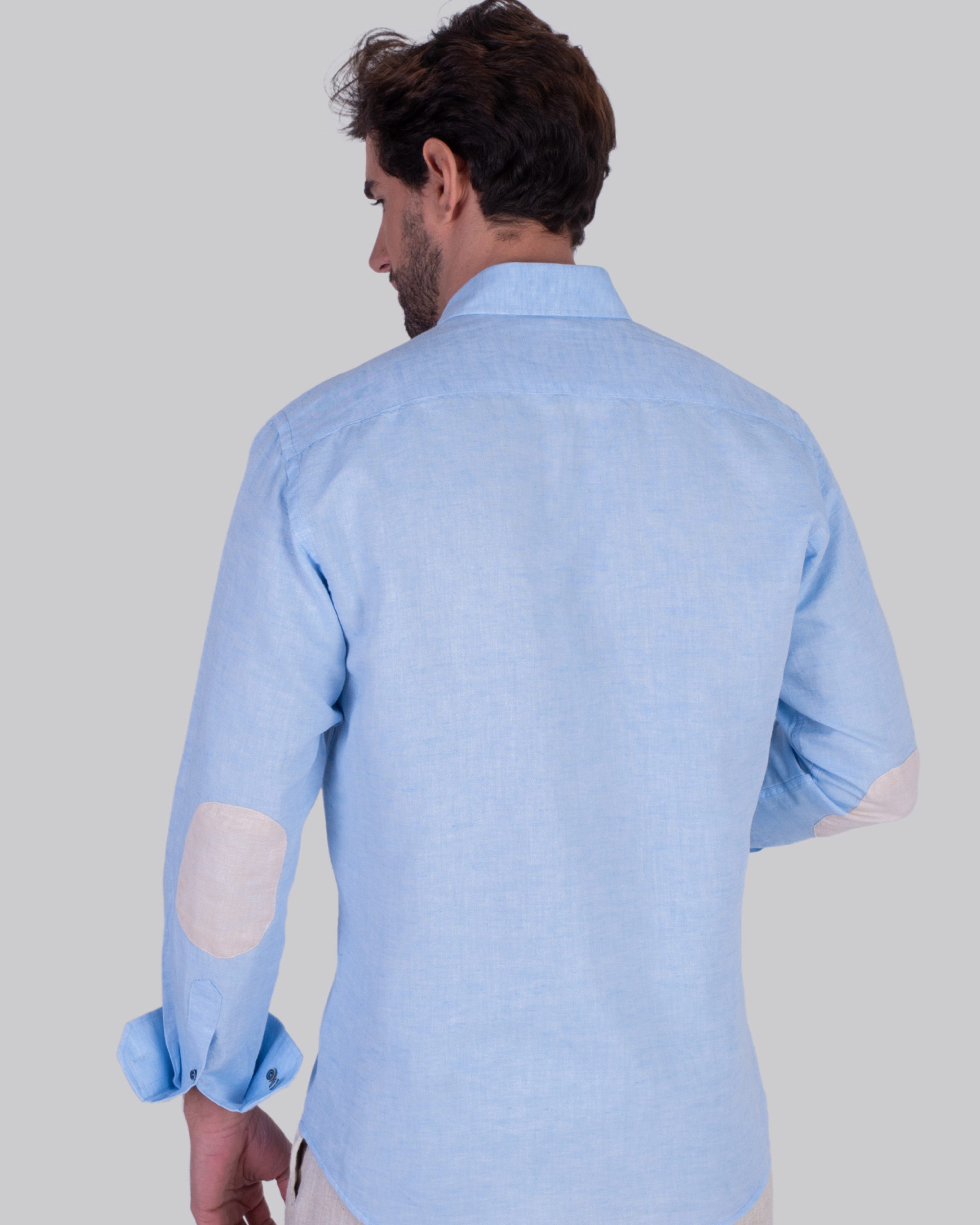 Camisa semientallada lisa, cuello botón y codera. Confeccionada en tejido oxford de 50% algodón / 50% lino.