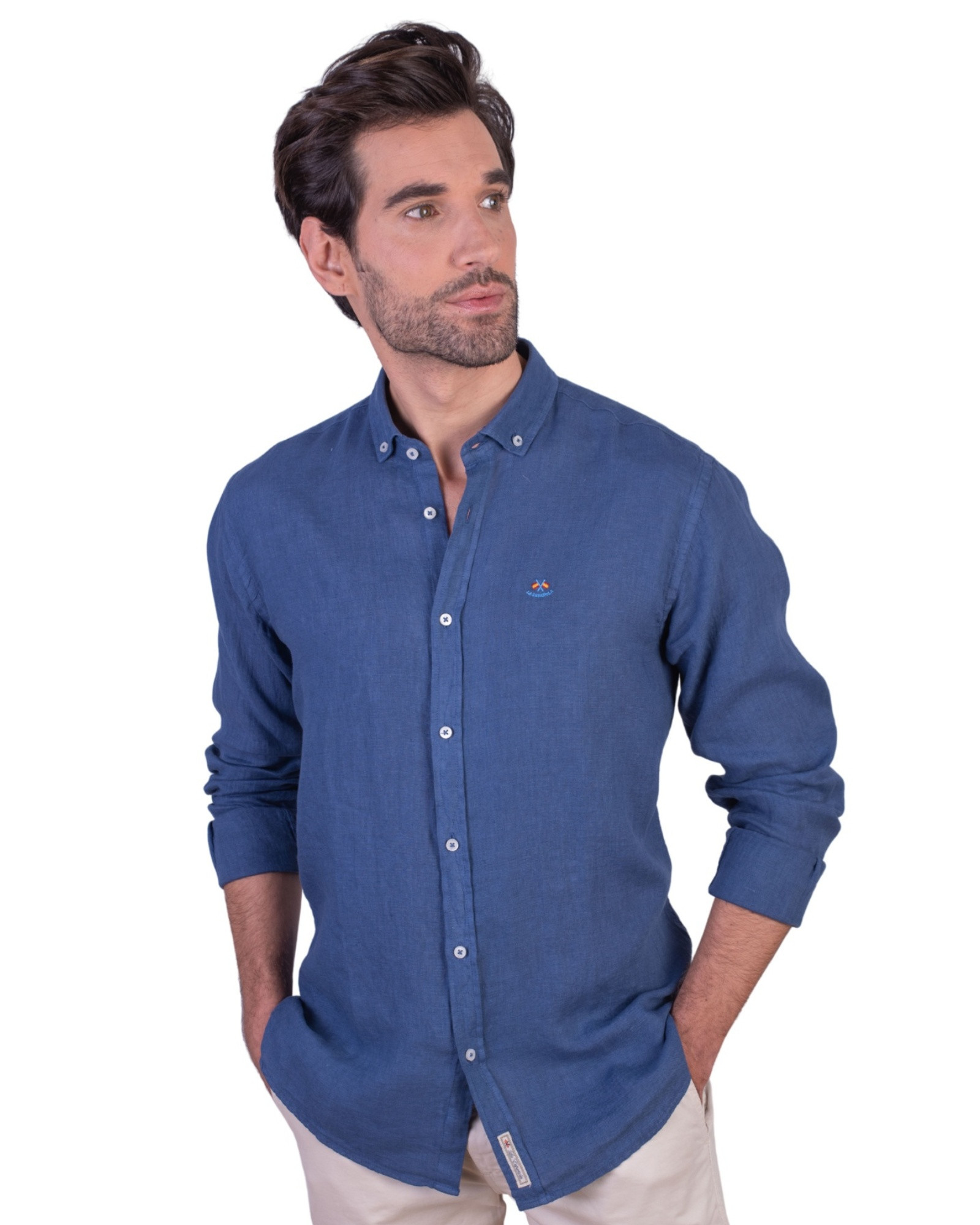InicioCatálogoColecciónCamisasCamisas semientalladasSerie 56143 Camisa lino lisa cuello botón