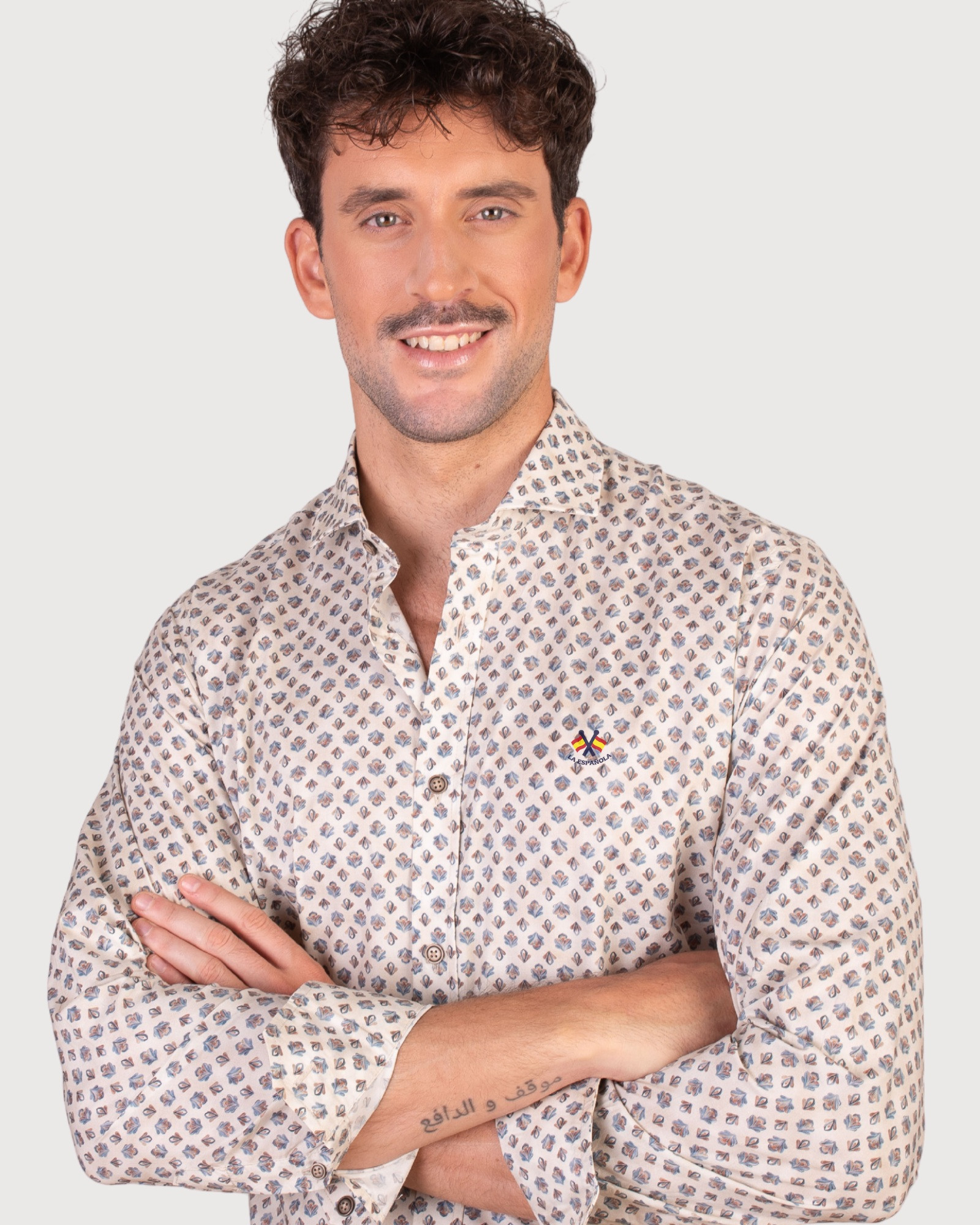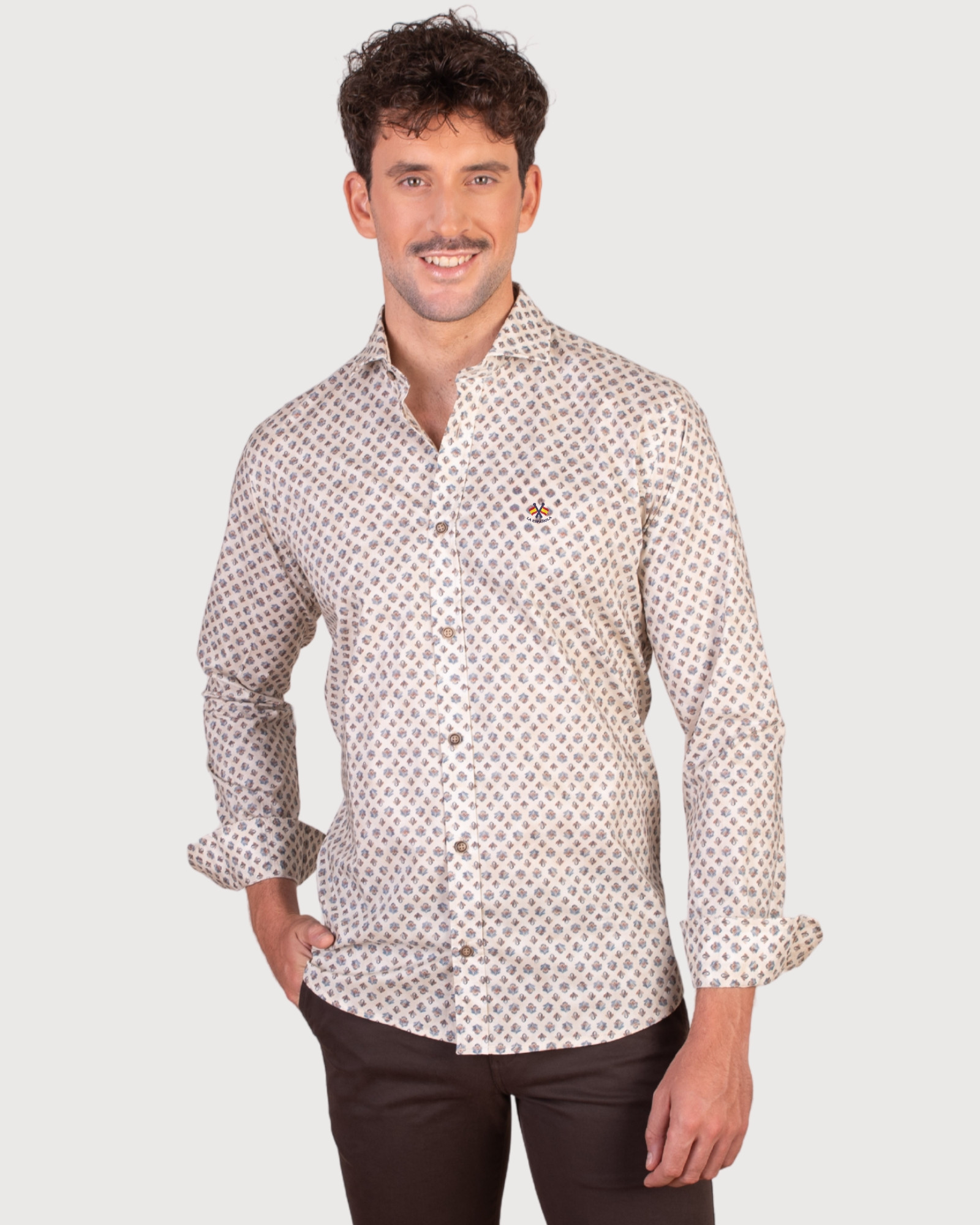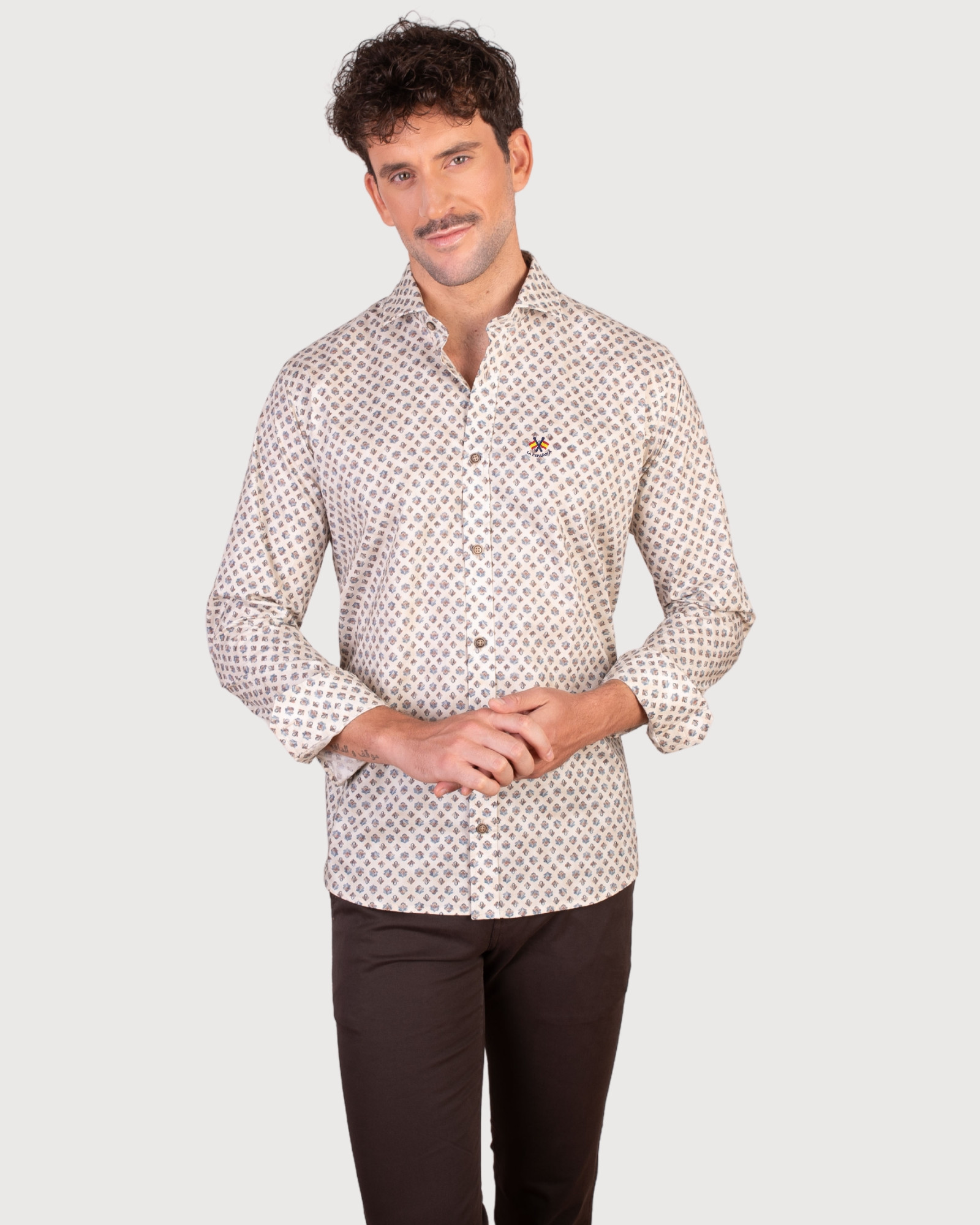 Camisa semientallada microestampada sin bolsillo y logo bordado. Confeccionada en 100% algodón