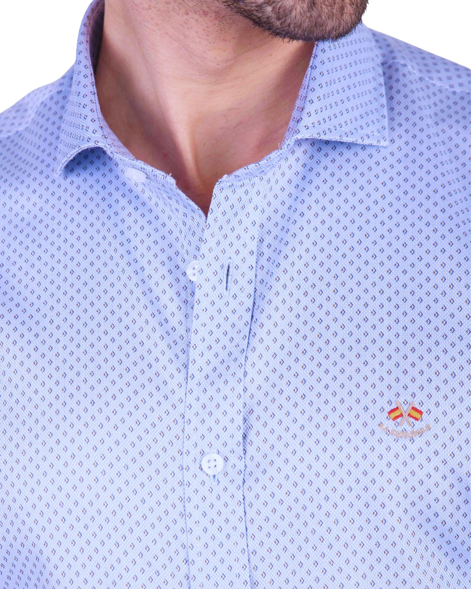 Camisa semientallada microestampada sin bolsillo y logo bordado. Confeccionada en 100% algodón