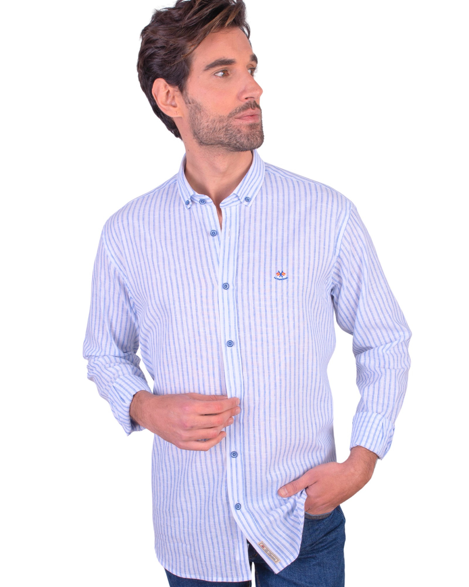 Serie 56463 Camisa algodon lino rayas cuello botón color azul